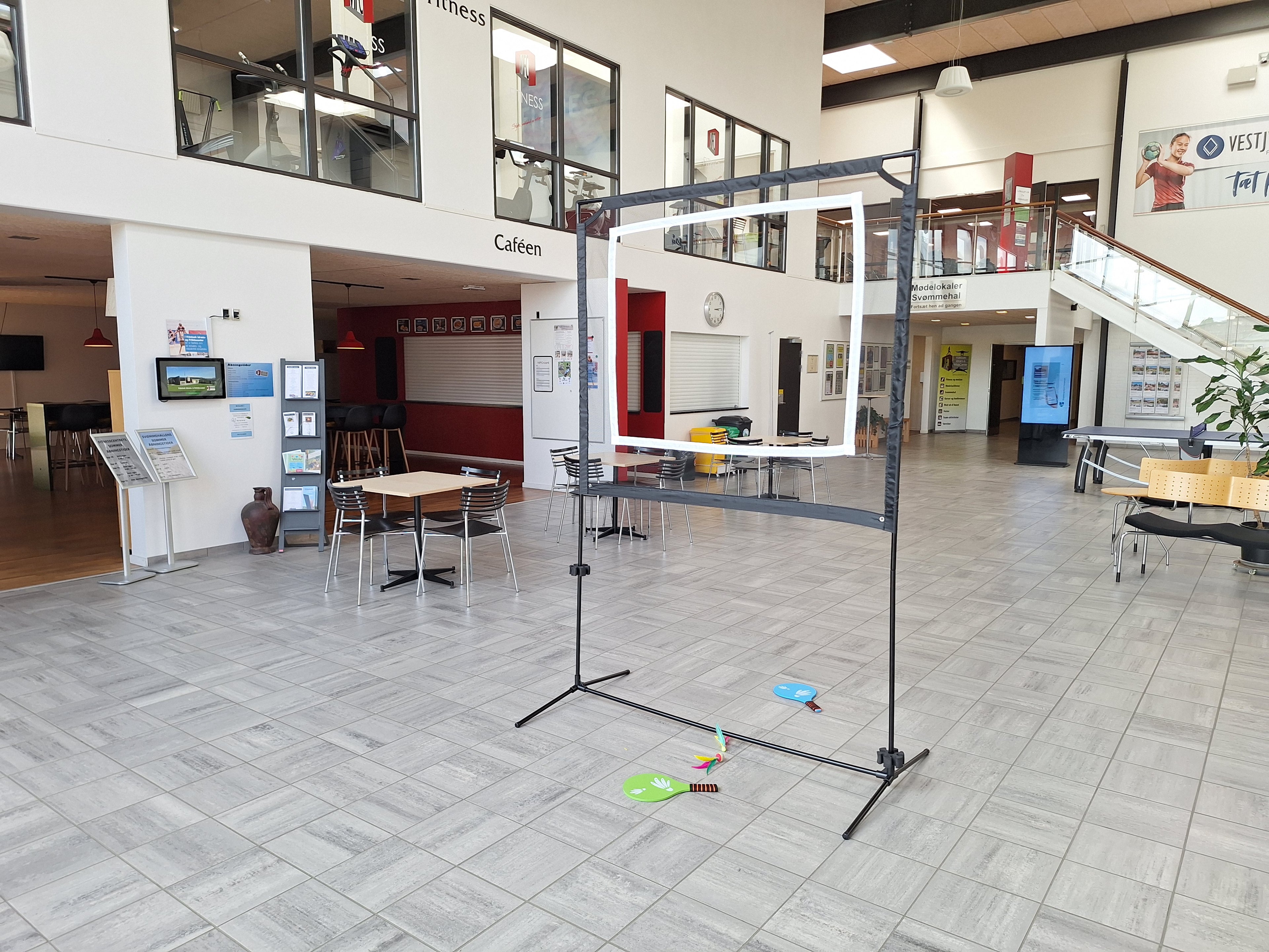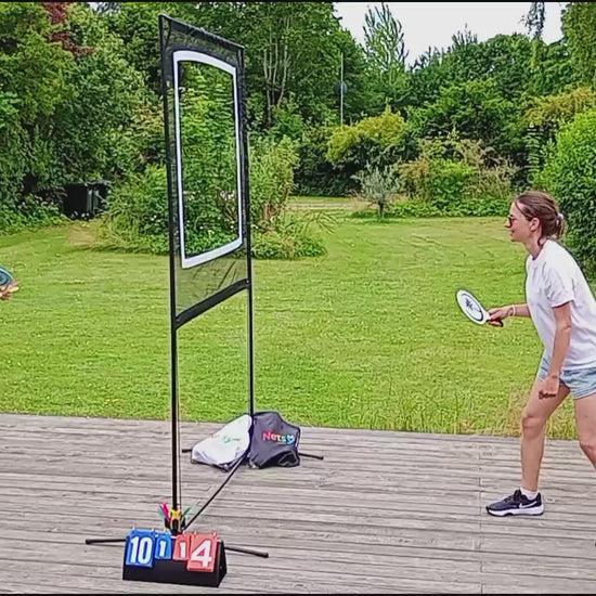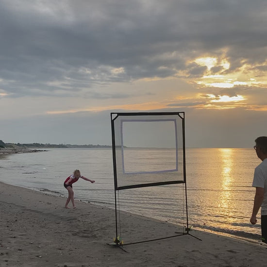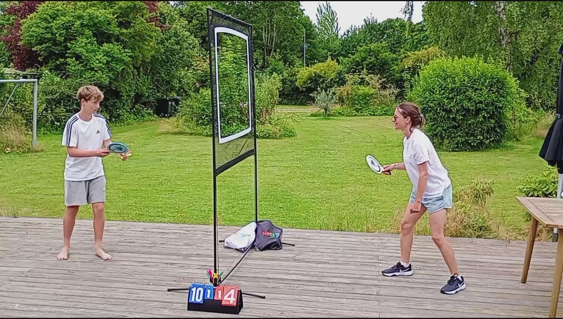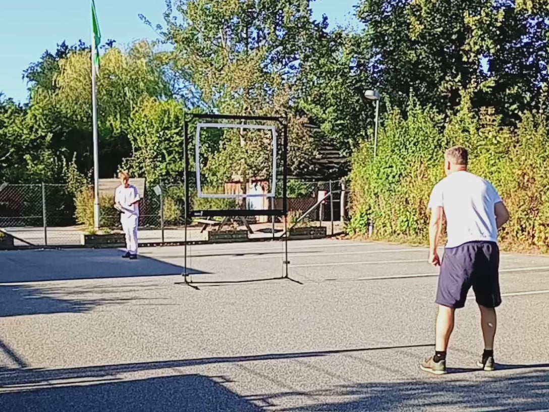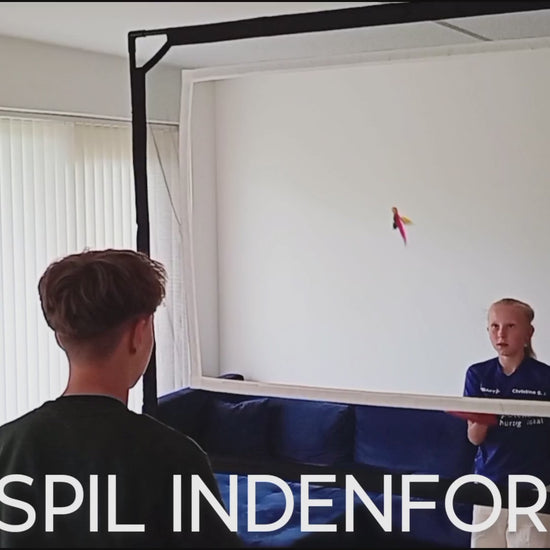 Start med to spillere og én af de tre bolde/fjerbolde som medfølger i alle spillesæt. Placér jer med cirka 1 meters afstand til nettet på hver side. Spil skiftevis gennem den hvide markererede åbning i nettet. Som i badminton og bordtennis, men her spilles igennem nettet.