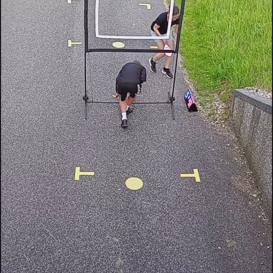 Der følger officielle banemål og spilleregler med i alle spillesæt – men du bestemmer selv, hvor præcis du vil være. Ønsker du at markere banen, kan du tilkøbe gule banemarkører i shoppen – perfekte til asfalt, terrasse eller indendørs.