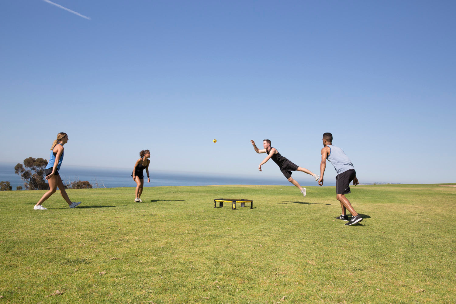 2 mod 2. Server bolden ned i nettet. Modstanderne har 3 berøringer. Slå den tilbage ned i nettet. Fri bevægelse hele vejen rundt. Point når modstanderne ikke kan returnere. Resultat: Hurtigt, intenst, sjovt – et moderne rundnet-spil til strand, have og park.